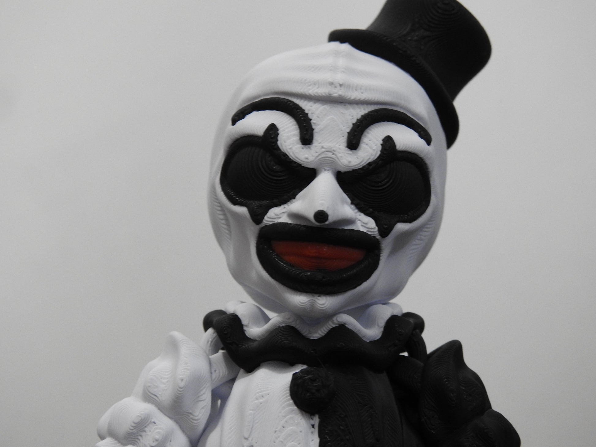 - The clown features a distinctive black top hat and a bow tie. It's a playful and quirky design, suitable for those who appreciate whimsical art. The figure stands out as a creative addition to your collection or as a charming decoration.